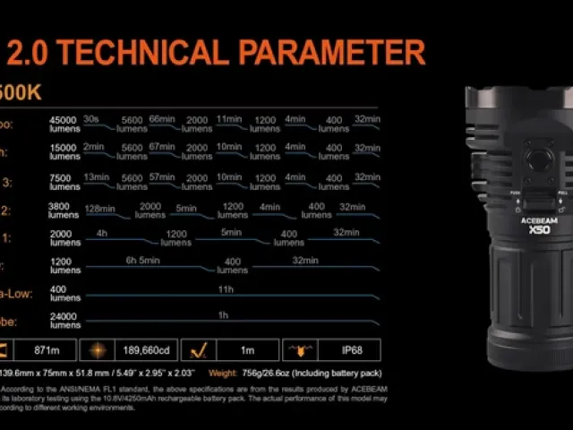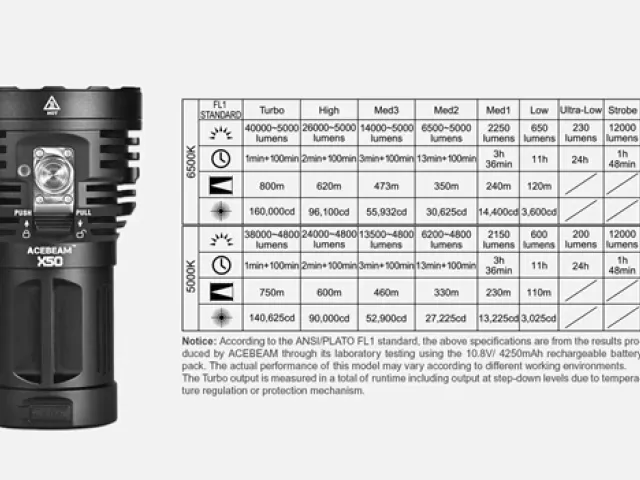 Additionally, the flashlight has a rechargeable battery that can be charged using the included USB-C cable. Overall, the Acebeam X50 2.0 6500k flashlight is an excellent choice for anyone who needs a bright, durable flashlight for outdoor activities.