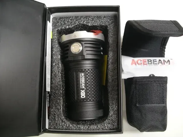 The X80 is powered by four Acebeam high-drain (20A) 3,100mAh protected lithium-ion rechargeable batteries, which provide a long-lasting power source. All functions of the flashlight can be accessed from a single button, making it easy to operate with one hand. The flashlight is built with advanced electronics, machined from aircraft-grade aluminum, and sealed to withstand underwater use up to 30 meters, ensuring a long service life even in the most adverse conditions.