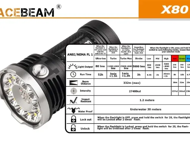 The Acebeam X80 features a range of LED emitters, including 12 CREE XHP50.2 emitters, 2 CREE XPE2-R2 630nm red emitters, 2 CREE XPE2-B4 475nm blue emitters, 2 CREE XPE2-G3 530nm green emitters, and 1 Nichia 233A 365nm ultra-violet emitter. The flashlight has a maximum output of 25,000 lumens and a range of modes, including ultra-low, low, mid, high, turbo, turbo-max, strobe, red, green, blue, and UV.